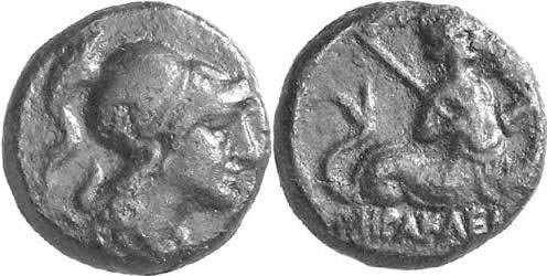 Obv. hd Athena r wearing Corinthian helmet (sometimes decorated with griffin)