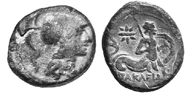 Rev. marine deity (Glaukos?) r with human torso and a fish's tale, carying shield and spear. Usually helmeted.