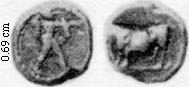 0.34 450-430 BC hemiobol Poseidon r./bull l. Mun 1070
