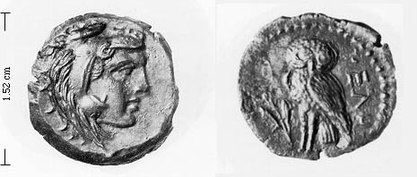 Mangieri 186 2.35 g Sallusto 1104 this coin 1st specimen 2nd specimen Mangieri (1986) 425 BC - 1C BC Rutter (1977) 425 -390 BC Di Bello (1977) 390 BC - classification according to Rutter AE 16 3.70- 4.81 6 hd Heracles /owl [II] AE 15-18 2.68- 4.74 10 hd Heracles /owl within wreath [III, M 188-189] AE 15 1.75- 3.43 24 hd Heracles /owl [IV, M 186-187] AE 11 1.50 1 hd Heracles /owl [V]
