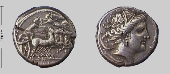 Obv. quadriga, Nike; RSMLQRT Rev. hd Tanit, 3 dolphins