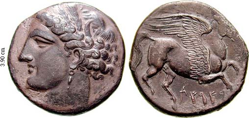 Rev. Pegasus; Punic text B'RST (=in the land or territory)