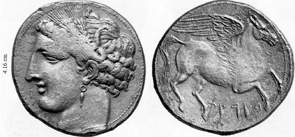 Rev. Pegasus; Punic text B'RST (=in the land or territory)